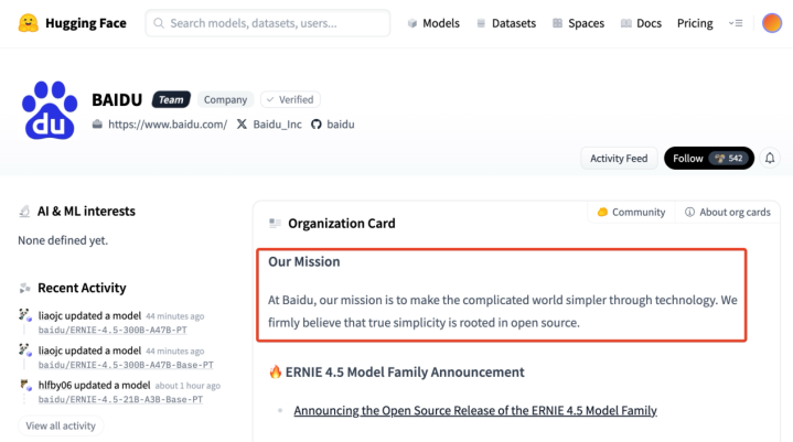 当然,有关Mission的这两句话是最近几天新加的。主要之前如果这么写,好像也不合适。因为在这轮文心大模型4.5系列模型开源之前,百度在Hugging Face上并没有开源过任何自己的私有模型。