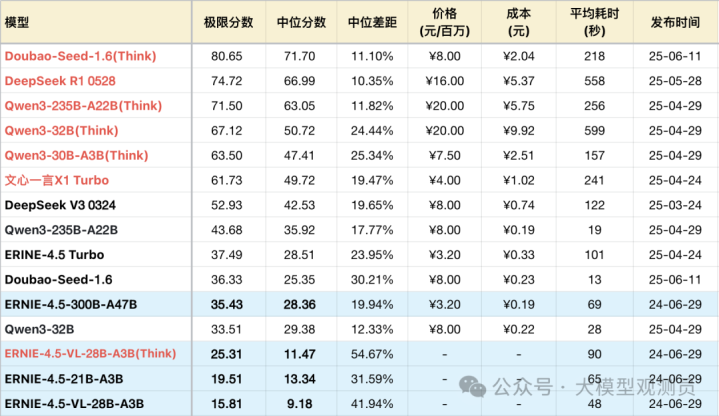 从大模型观测员等第三方评测结果看,这次的文心大模型4.5系列,跟现有的旗舰开源模型如DeepSeek R1、Qwen 3等相比仍有差距。